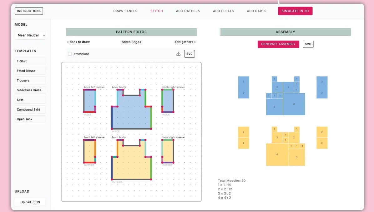 Процесс начинается в интерфейсе «Редактора узоров», с помощью которого пользователь отображает простую сетку и, соединяя точки, обводит контуры нужного предмета одежды. По сути, вы определяете прямоугольные панели, которые представляют собой блоки ткани (модули).